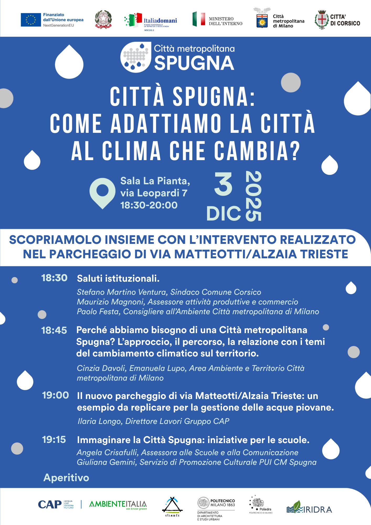 Durante l’incontro verrà raccontato nel dettaglio l’intervento realizzato a Corsico nel parcheggio di via Matteotti/Alzaia Trieste, e si approfondirannoi temi della “Città Spugna”, un nuovo approccio alla progettazione urbana che mira a rendere il territorio più resiliente, sostenibile e pronto ad affrontare le sfide del cambiamento climatico.