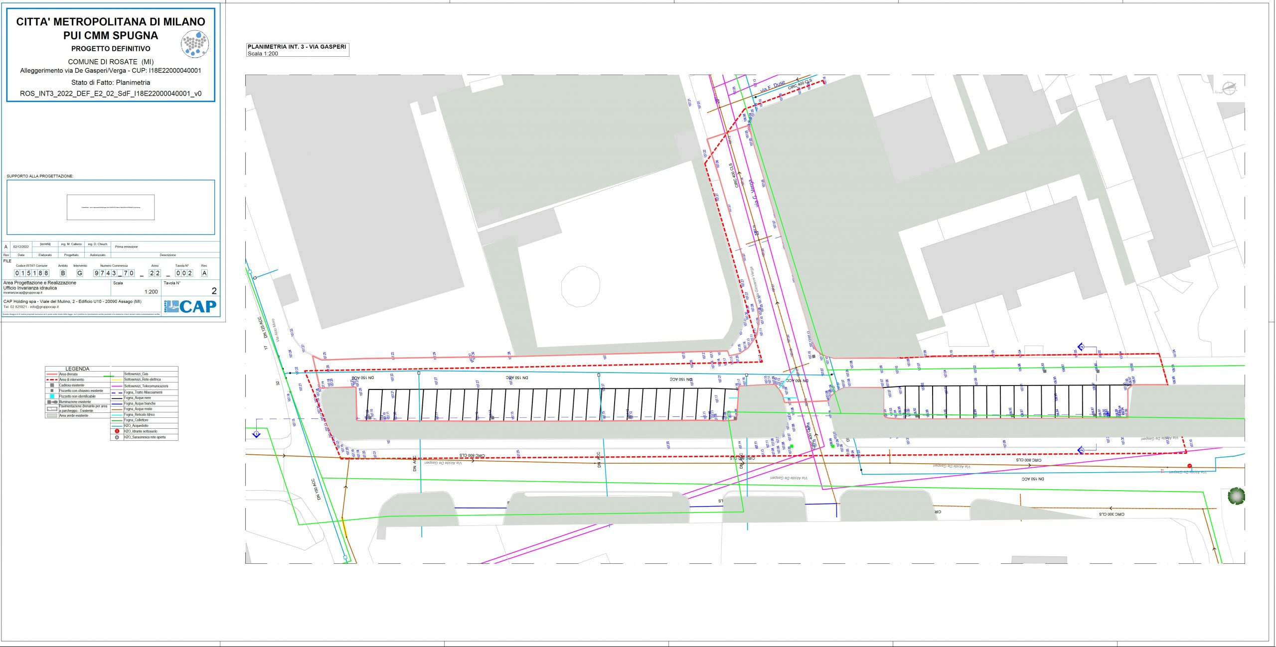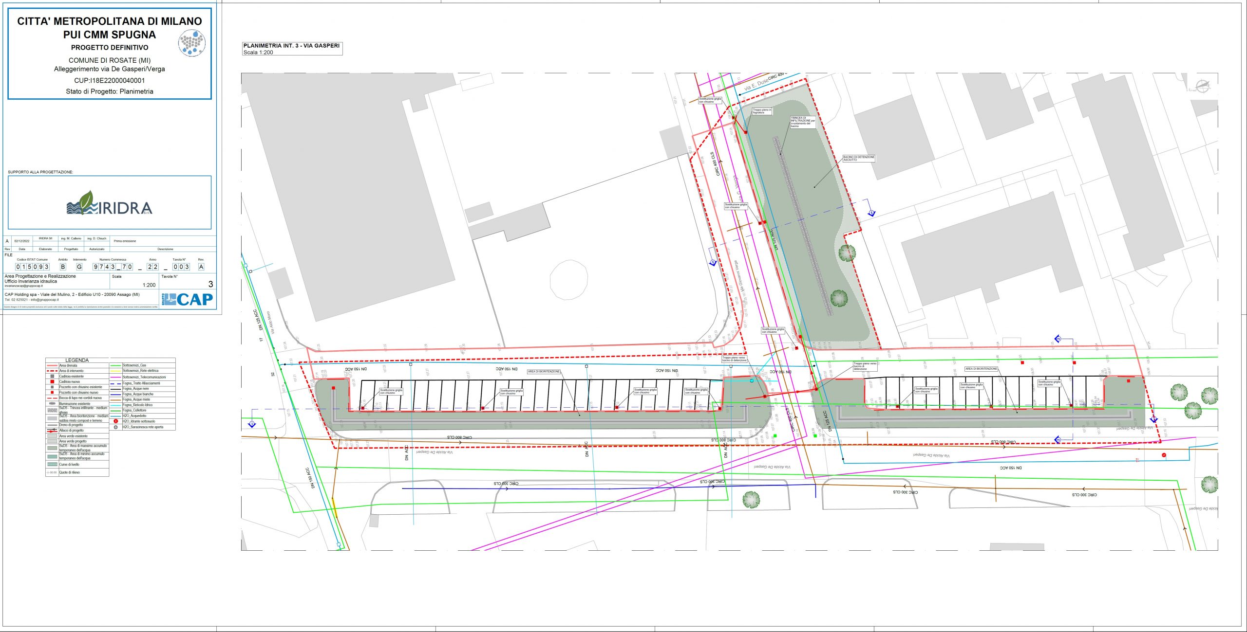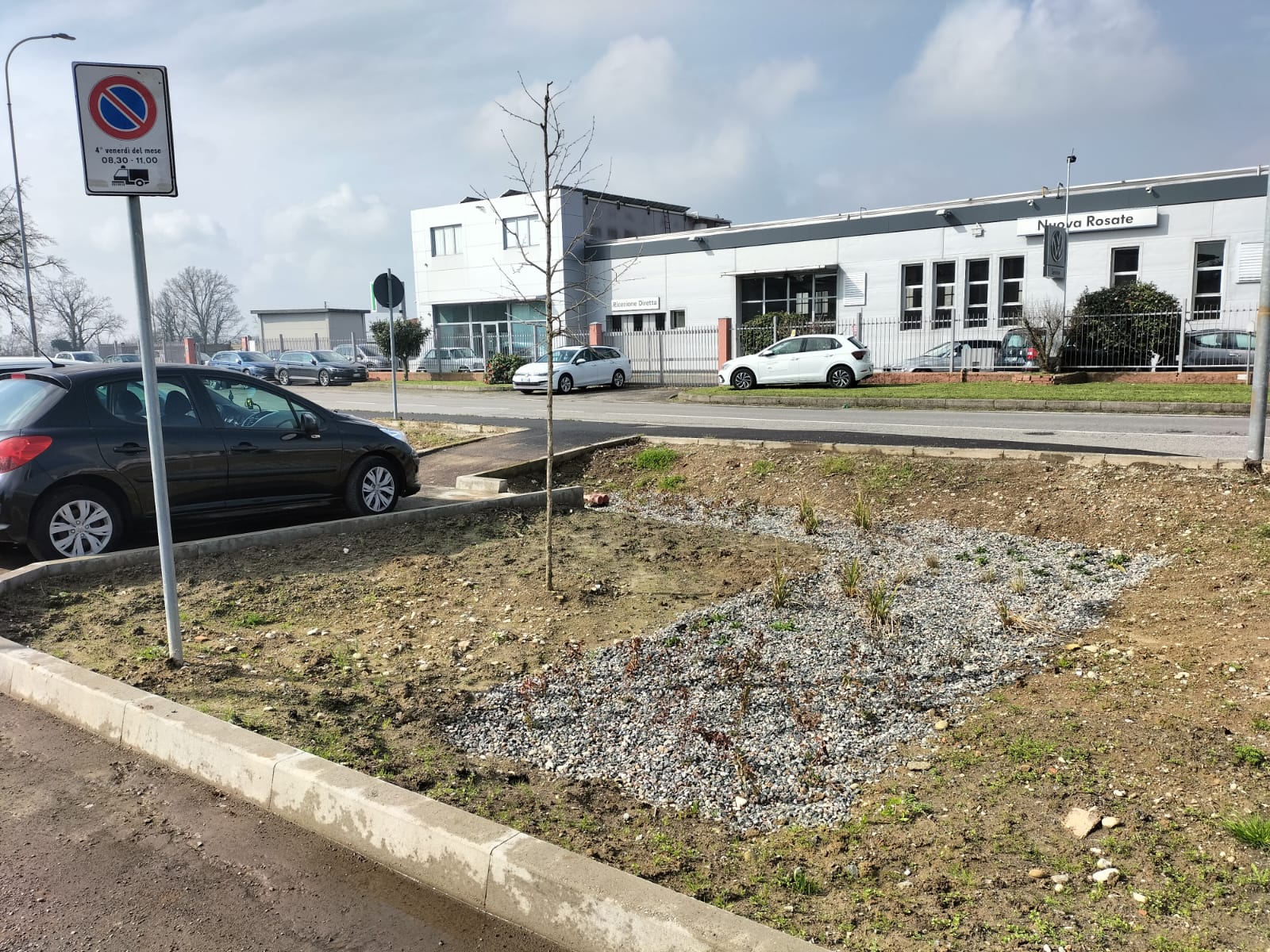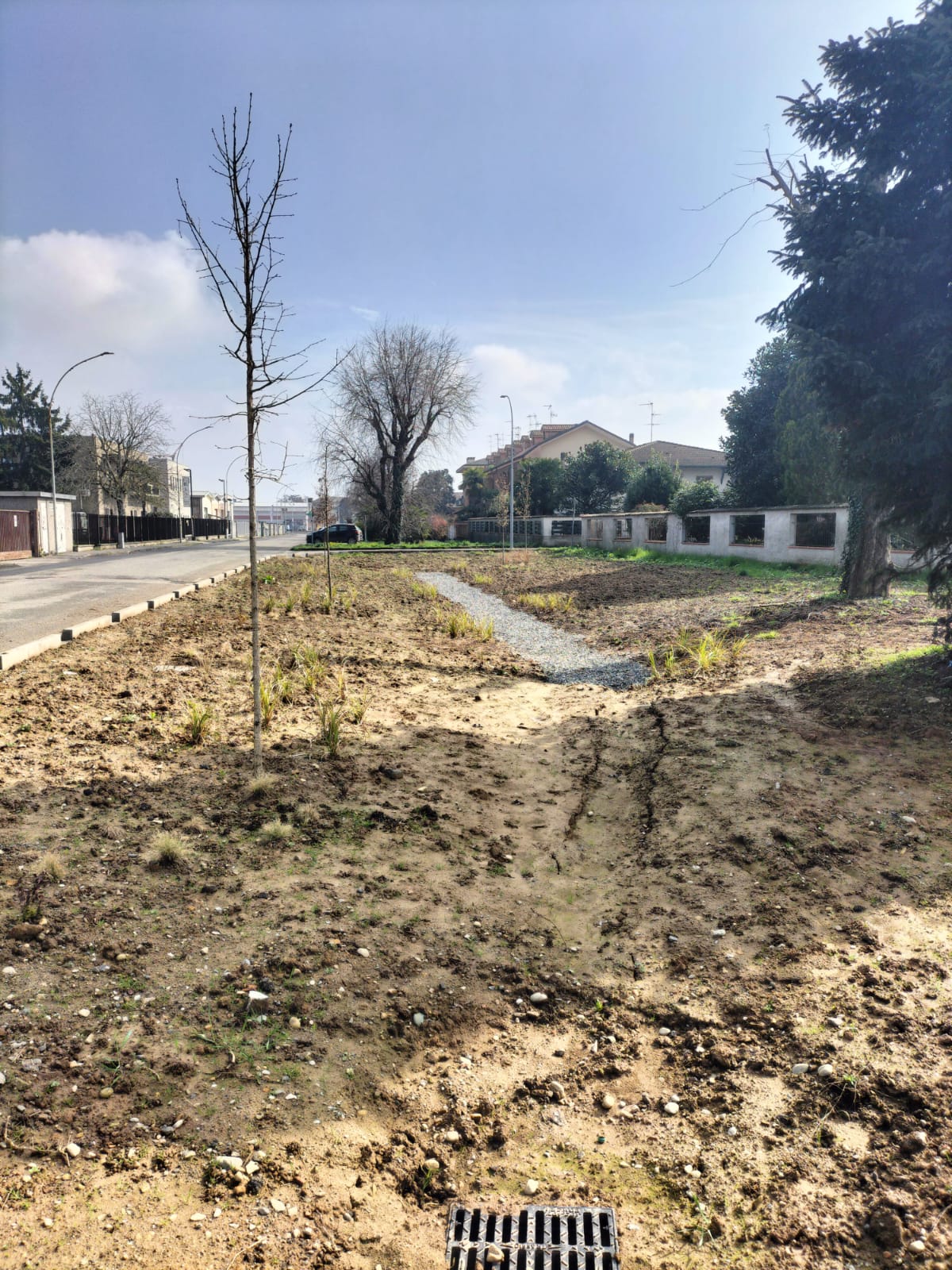 L’intervento ha previsto la realizzazione di due ampie aree di bioritenzione, disposte una di fronte all’altra e progettate per raccogliere le acque provenienti dalla strada adiacente anche tramite il sistema di caditoie esistente. All’interno di queste aree sono state inserite trincee drenanti che favoriscono l’infiltrazione e la gestione naturale delle acque piovane. Le due aree sono collegate tra loro e una di esse, è connessa ad un bacino di detenzione situato frontalmente. Quest’ultimo svolge una funzione di sicurezza idraulica: in condizioni di precipitazioni particolarmente intense, un sistema di troppo pieno consente lo scarico controllato delle acque verso la rete fognaria. Per migliorare l’efficienza del sistema, il progetto ha previsto anche la modifica delle pendenze della superficie, in modo da convogliare naturalmente l’acqua verso le aree di bioritenzione e favorirne il trattamento e l’assorbimento.
