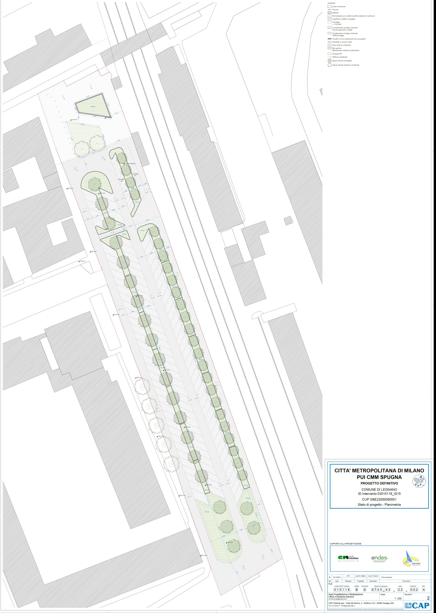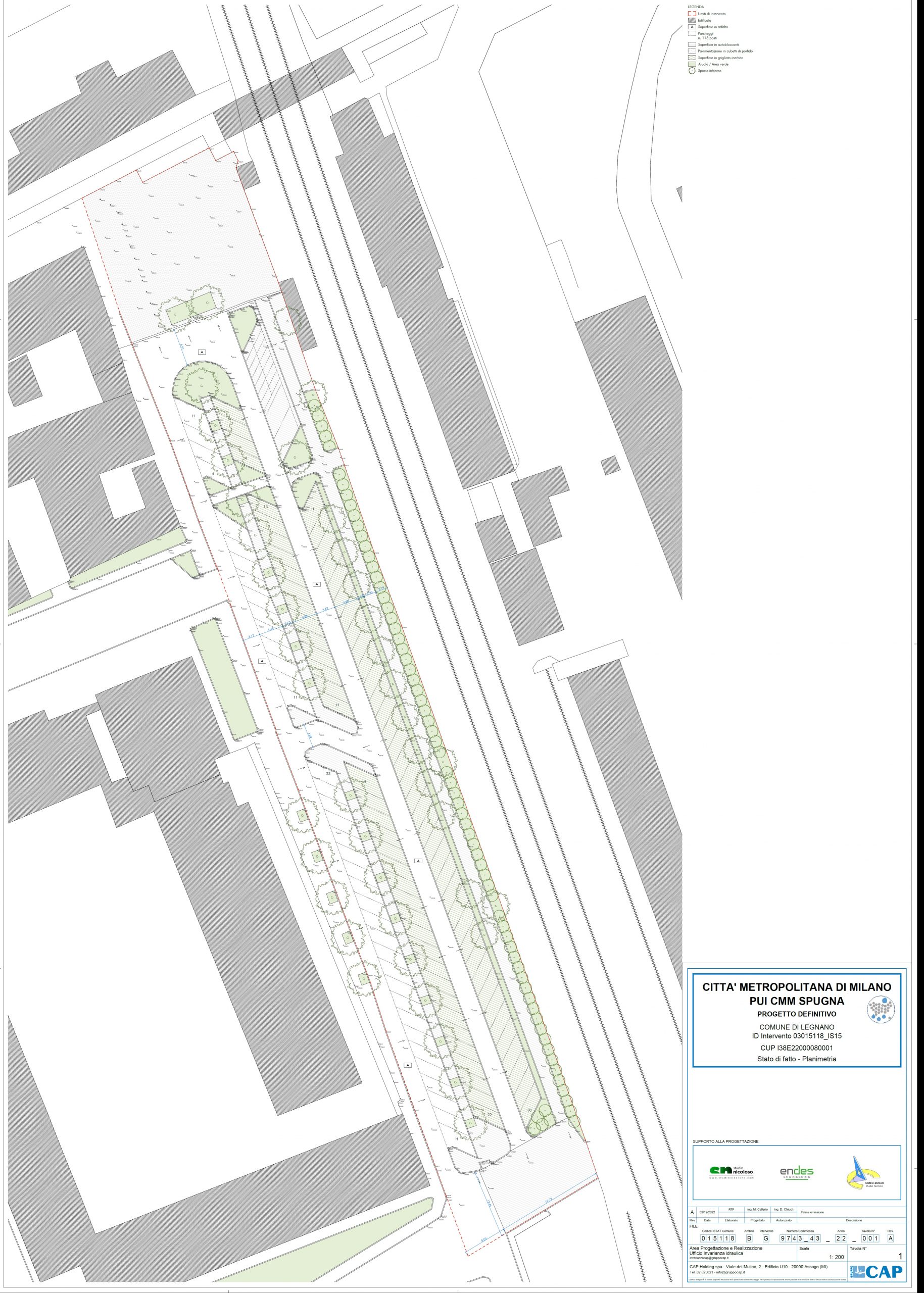 Nel comune di Legnano, il PUI CM Spugna ha permesso di realizzare in un ampio parcheggio adiacente alla stazione ferroviaria, un intervento di disconnessione della rete delle acque meteoriche dalla rete fognaria mediante la realizzazione di Sistemi di drenaggio urbano sostenibile. Il progetto ha previsto di riqualificare il parcheggio dal punto di vista della gestione delle acque di pioggia. Gli stalli del parcheggio sono stati realizzati con gli autobloccanti drenanti e il corsello centrale del parcheggio e la via adiacente (Via Gaeta) sono stati ri-asfaltati. Le caditoie delle aree asfaltate sono state collegate alle celle disperdenti presenti nel sottosuolo all’inizio del corsello del parcheggio. Inoltre, anche la pavimentazione della pista pedonale che costeggia il parcheggio è stata rifatta con autobloccanti drenanti e permeabili. Da progetto erano previsti rain garden che però non sono stati realizzati a causa della presenza del pavè che sarebbe stato troppo oneroso rimuovere. Sono state utilizzate, invece, come descritto sopra, le celle drenanti. Infine, sono state depavimentate le aiuole presenti. Non sono state aggiunte altre piante rispetto a quelle già presenti.