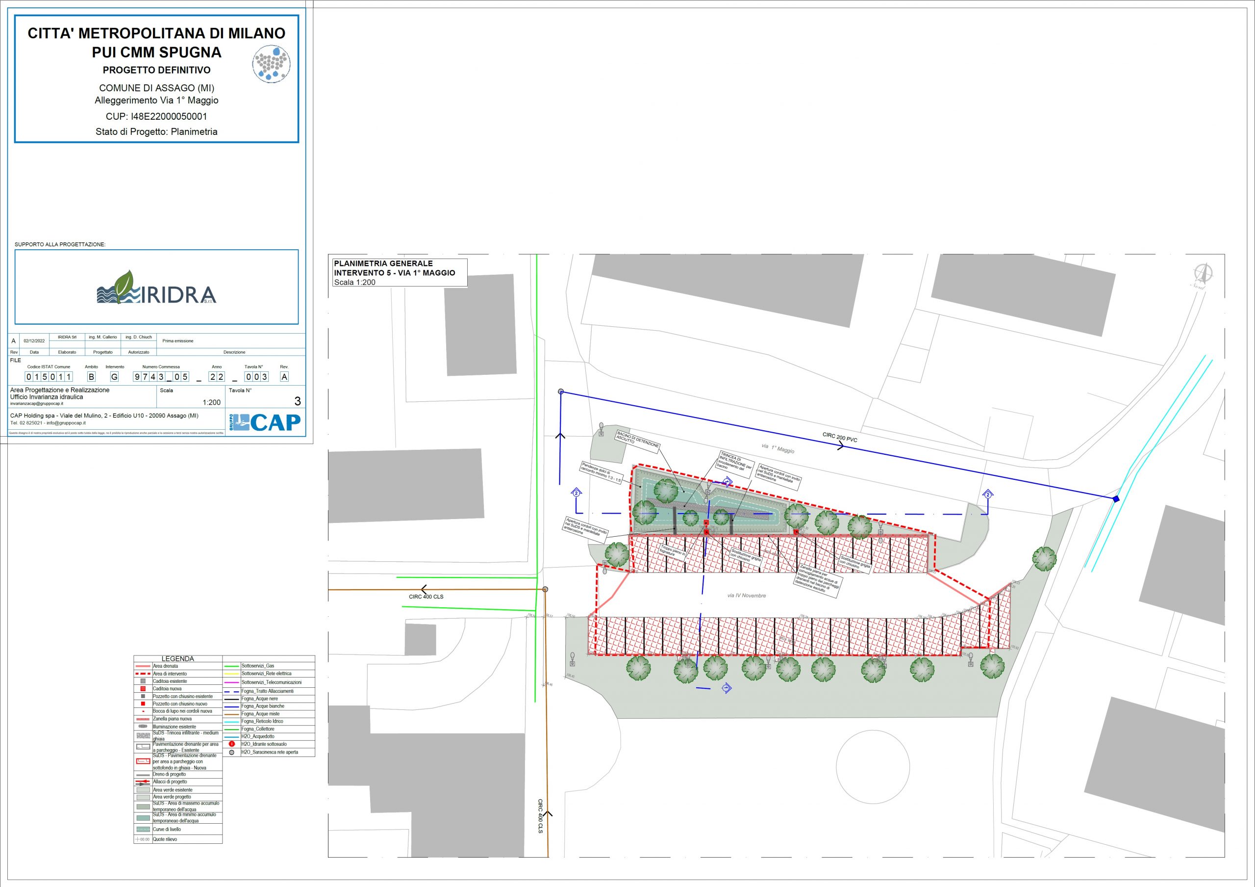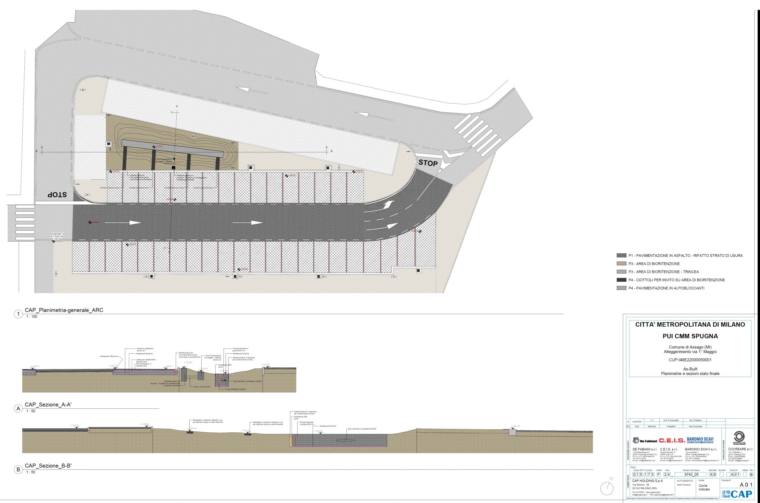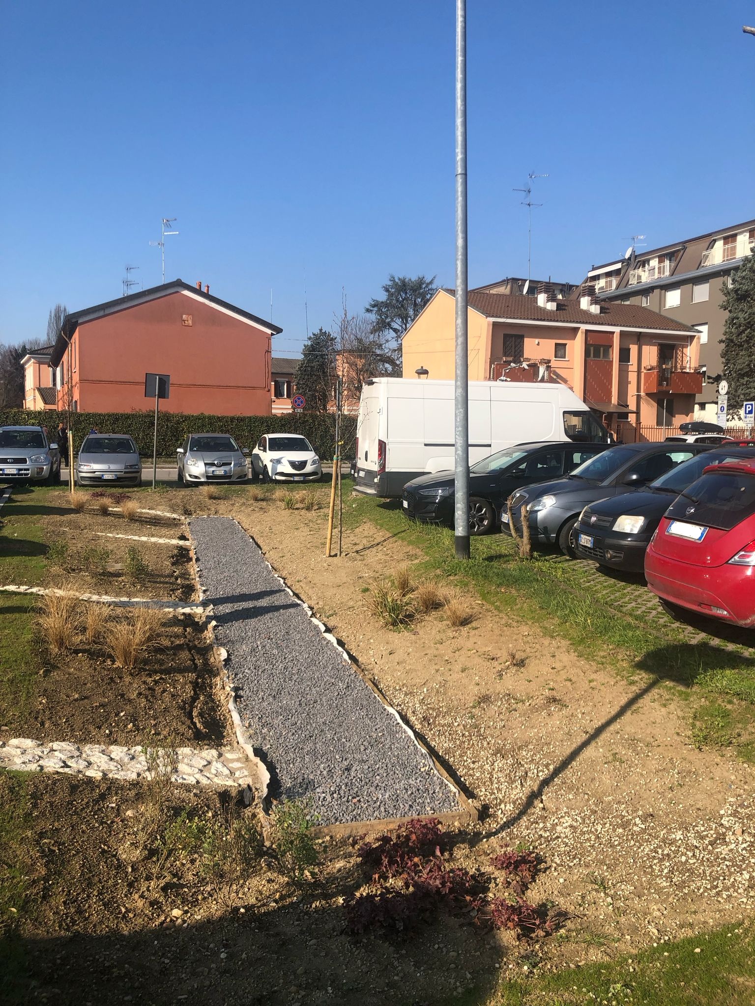 Uno dei sei interventi del PUI Città Metropolitana “Spugna” realizzati nel comune di Assago riguarda il parcheggio in Via 1° Maggio situato nel centro del paese ed esteso per 980 mq. Si tratta di un intervento di alleggerimento della rete fognaria mediante sistemi di drenaggio sostenibile (SUDS): le acque meteoriche che piovono sull’area del parcheggio vengono convogliate, tramite diverse pendenze, verso una trincea drenante posta al centro del parcheggio, al posto di entrare nel circuito della rete fognaria. Grazie al sistema della trincea drenante, l’acqua viene accumulata e, tramite sistemi di infiltrazione profonda, viene rilasciata gradualmente nel sottosuolo, contribuendo a ricaricare le falde acquifere e a ristabilire il ciclo naturale dell’acqua. Attorno alla struttura lineare della trincea drenante, è presente una grande aiuola nella quale sono state piantumate 64 piante erbacee di Carex buchananii, Carex pendula, Gaura lindheimeri e Coronilla emerus e tre piante arboree (un carpino bianco, un nocciolo turco e un pero chanticleer). Sono stati rifatti anche alcuni stalli per il parcheggio in calcestruzzo drenante. Questo intervento è un esempio di sia possibile, anche agendo su un semplice parcheggio, rendere il territorio del comune di Assago più resiliente agli effetti del cambiamento climatico, in particolare ai fenomeni di precipitazioni estreme.