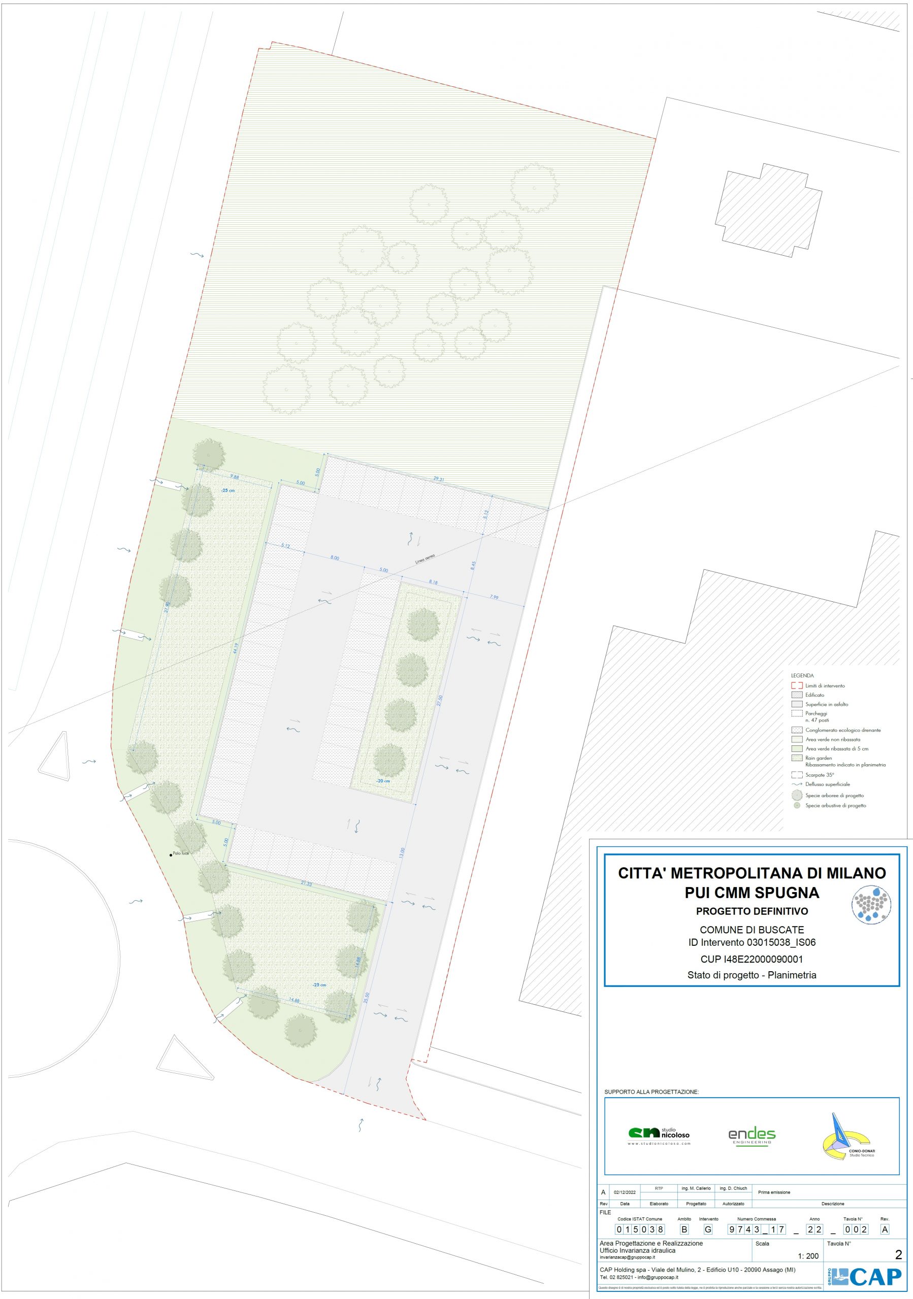 L’intervento ha previsto la realizzazione di tre rain garden, due lungo il perimetro e uno centrale ampliato da una preesistente aiuola, e l’adozione di pavimentazioni drenanti in autobloccanti sugli stalli di sosta. Queste soluzioni hanno permesso la disconnessione idraulica del parcheggio, favorendo l’infiltrazione naturale delle acque piovane e riducendo il carico sulla rete fognaria. Il sistema idraulico include anche un collegamento tra i rain garden e un troppo pieno verso la fognatura esistente, mentre nuove cordonature convogliano l’acqua verso le aree di infiltrazione. L’area è stata arricchita con la piantumazione di alberi (Acer campestre ‘Elsrijk’) e la semina a prato di tutte le superfici verdi, mentre il sottobosco adiacente è stato pulito da tronchi e rami secchi. Sono stati inoltre ripristinati manto e segnaletica dei corselli, con l’aggiunta di cartelli di regolamentazione del traffico secondo le indicazioni della Polizia Locale.