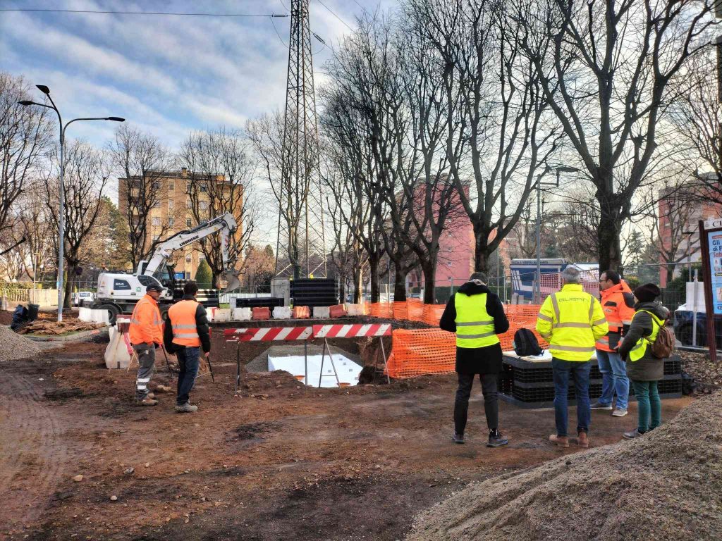 A causa della presenza di infrastrutture SNAM nel sottosuolo, non è stato possibile realizzare un rain garden come inizialmente previsto. In alternativa, l’intervento ha comunque perseguito l’obiettivo della depavimentazione attraverso la realizzazione di un’unica aiuola centrale, contribuendo alla riduzione delle superfici impermeabili. Le acque piovane sono convogliate e gestite tramite celle disperdenti, garantendo un corretto smaltimento e riducendo il carico sulla rete fognaria.