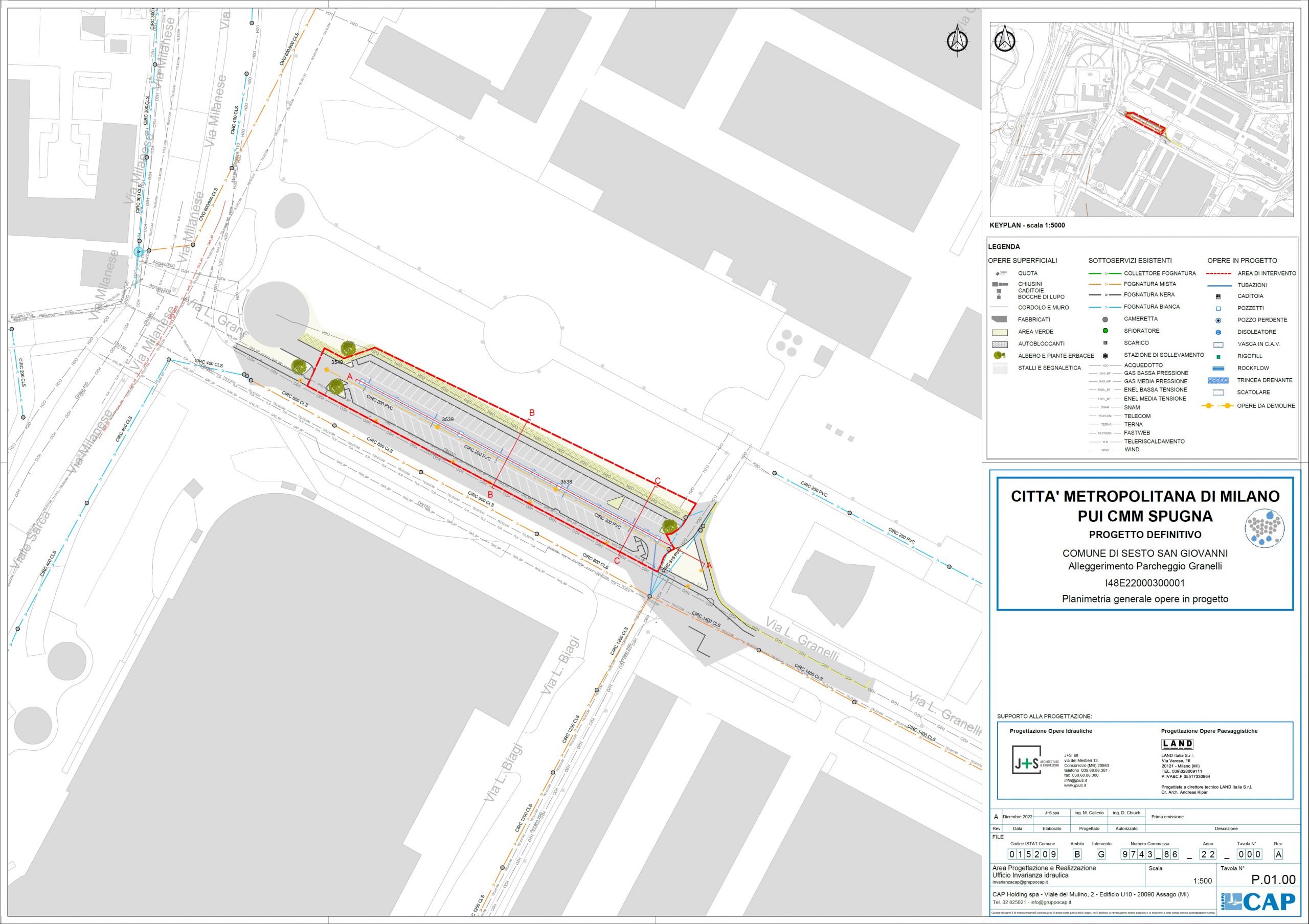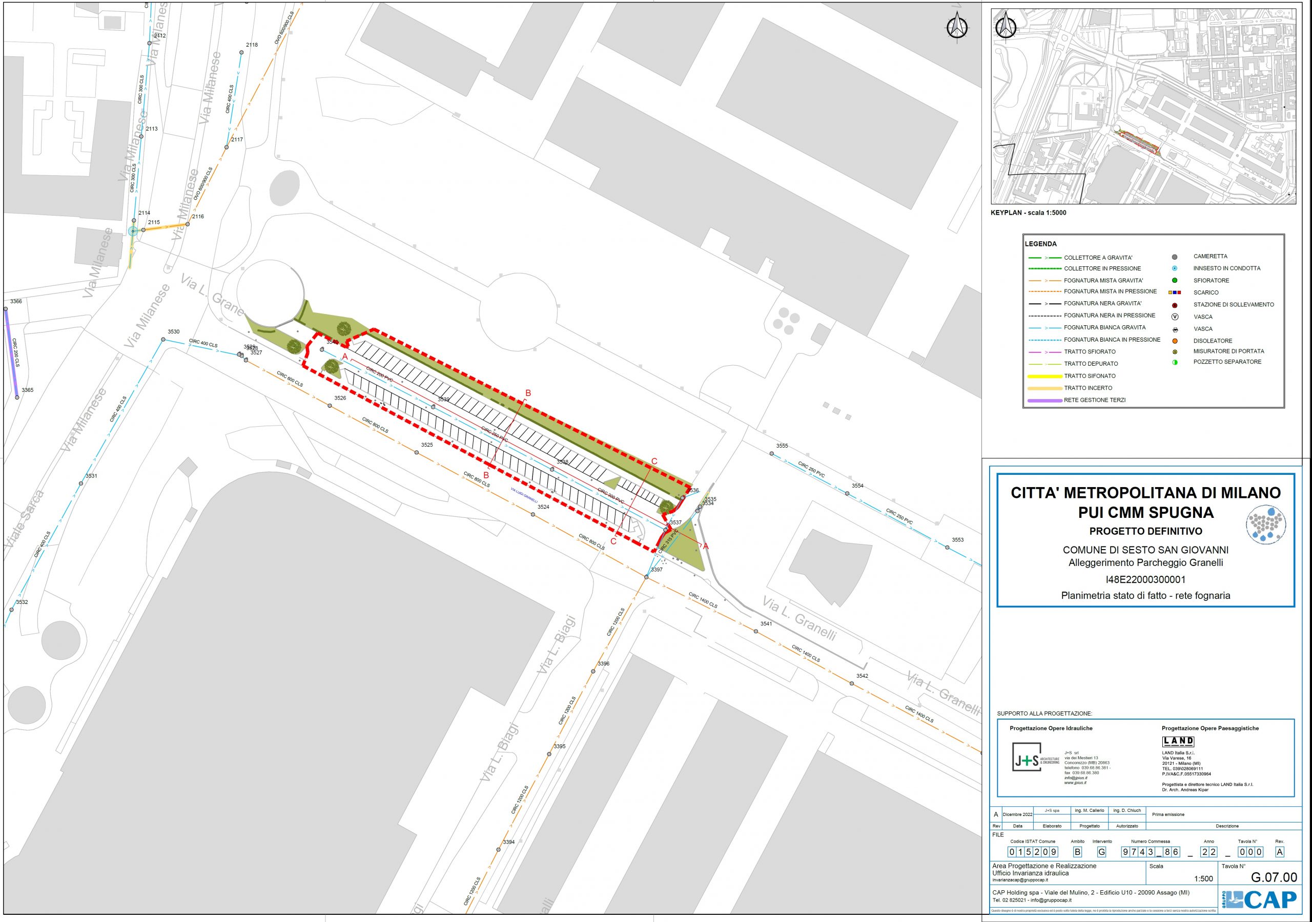 L’intervento realizzato nell’ambito del PUI CM Spugna in un’area adibita a parcheggio, si inquadra nella strategia di efficientamento della rete di drenaggio urbano, con l’obiettivo di ridurre l’apporto di acque meteoriche nella fognatura mista esistente.