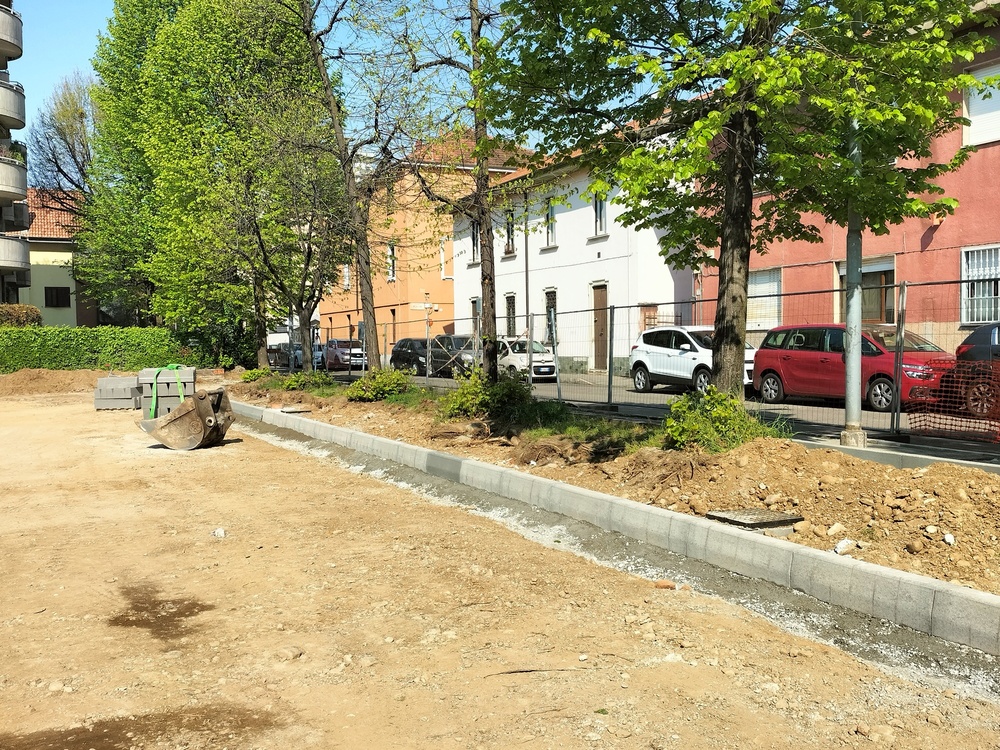 Nell’area oggetto di intervento è stata realizzata un’operazione di disconnessione idraulica della rete di drenaggio delle acque meteoriche del parcheggio, ottenuta attraverso l’impiego di pavimentazioni drenanti. Questa soluzione consente di favorire l’infiltrazione delle acque piovane direttamente nel suolo, contribuendo a ridurre il carico sulla rete fognaria e migliorando la gestione delle precipitazioni in ambito urbano. Prima della riqualificazione, l’area era occupata da un parcheggio con pavimentazione in asfalto completamente impermeabile, che convogliava integralmente le acque meteoriche nella rete di smaltimento, senza alcuna possibilità di infiltrazione o gestione in loco. Il progetto originario prevedeva inizialmente anche la realizzazione di un rain garden, progettato per raccogliere e gestire parte delle acque meteoriche provenienti dalla superficie del parcheggio attraverso un sistema di infiltrazione e fitodepurazione. Nel corso dello sviluppo progettuale questa soluzione non è stata tuttavia realizzata. Sono state invece mantenute le caditoie esistenti, che svolgono ora principalmente una funzione di troppo pieno, entrando in funzione solo in caso di eventi meteorici particolarmente intensi, quando la capacità di infiltrazione della pavimentazione drenante viene superata.