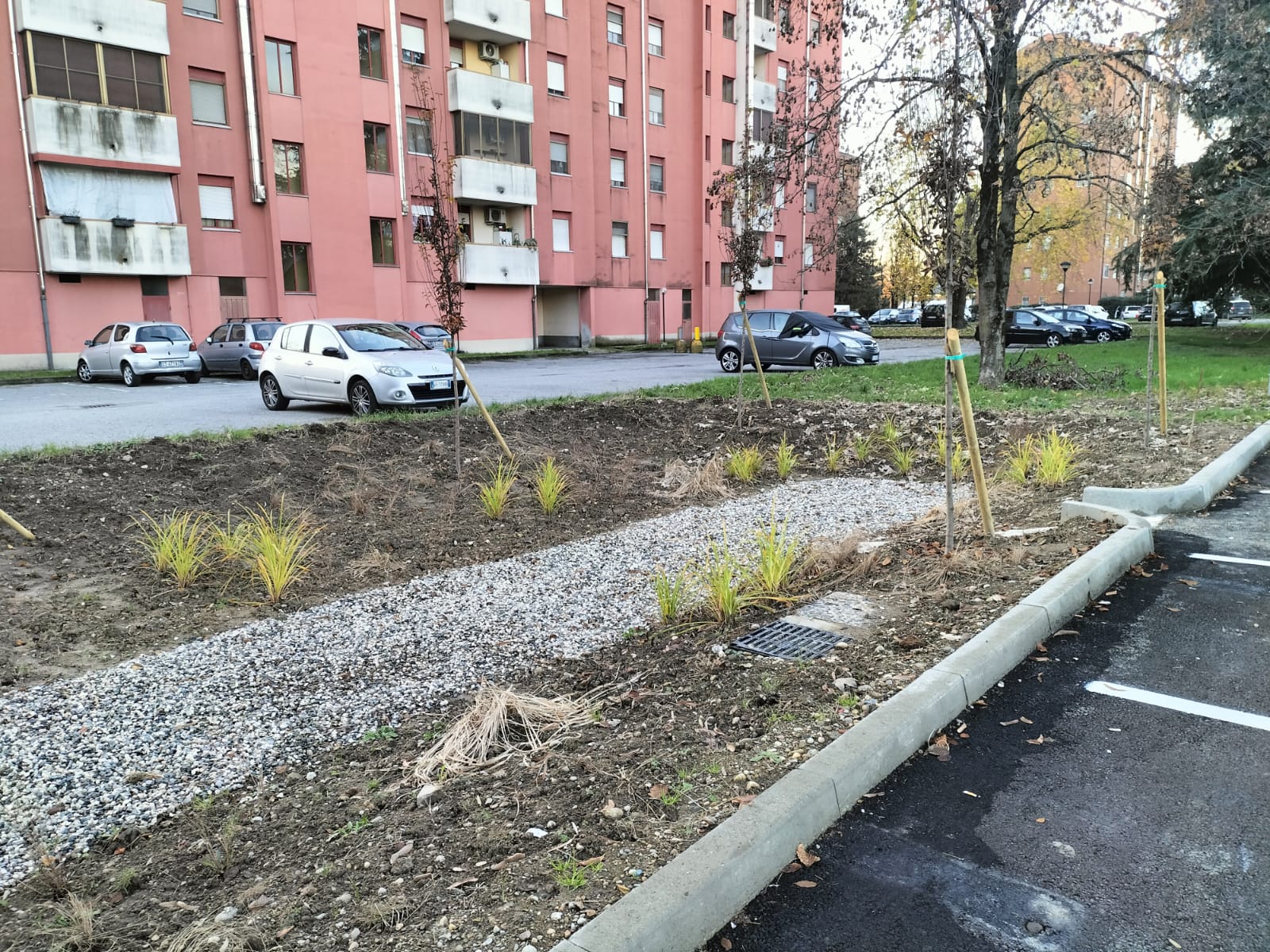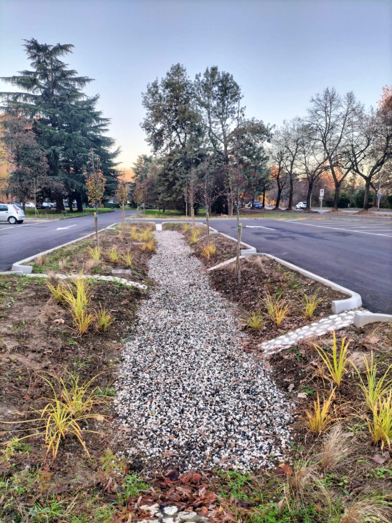 Oltre alla gestione delle acque in modo sostenibile l’area ora risulta riqualificata: da un semplice parcheggio asfaltato e impermeabile ora ospita tre aree verdi che contribuiscono al miglioramento complessivo dell’area.