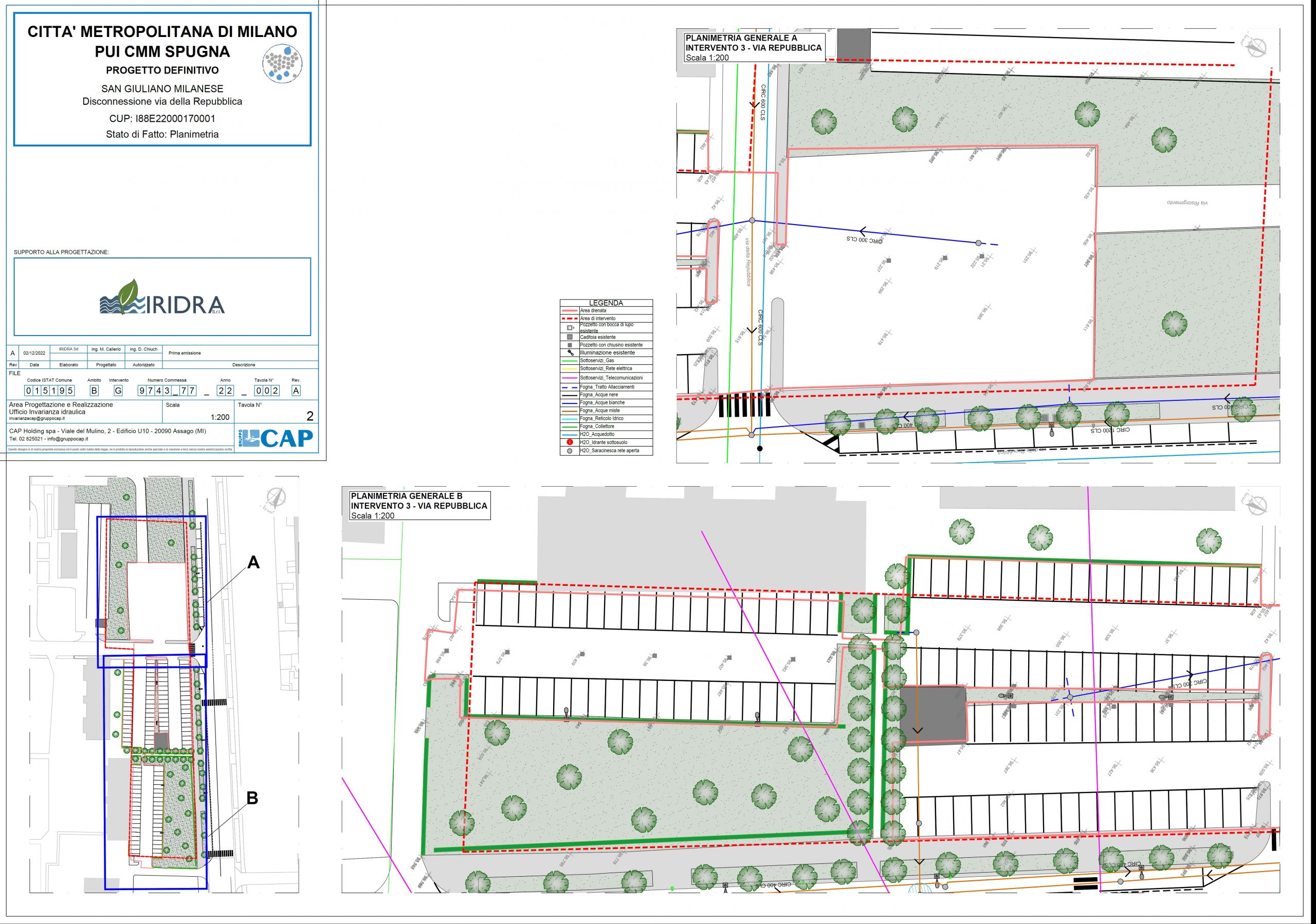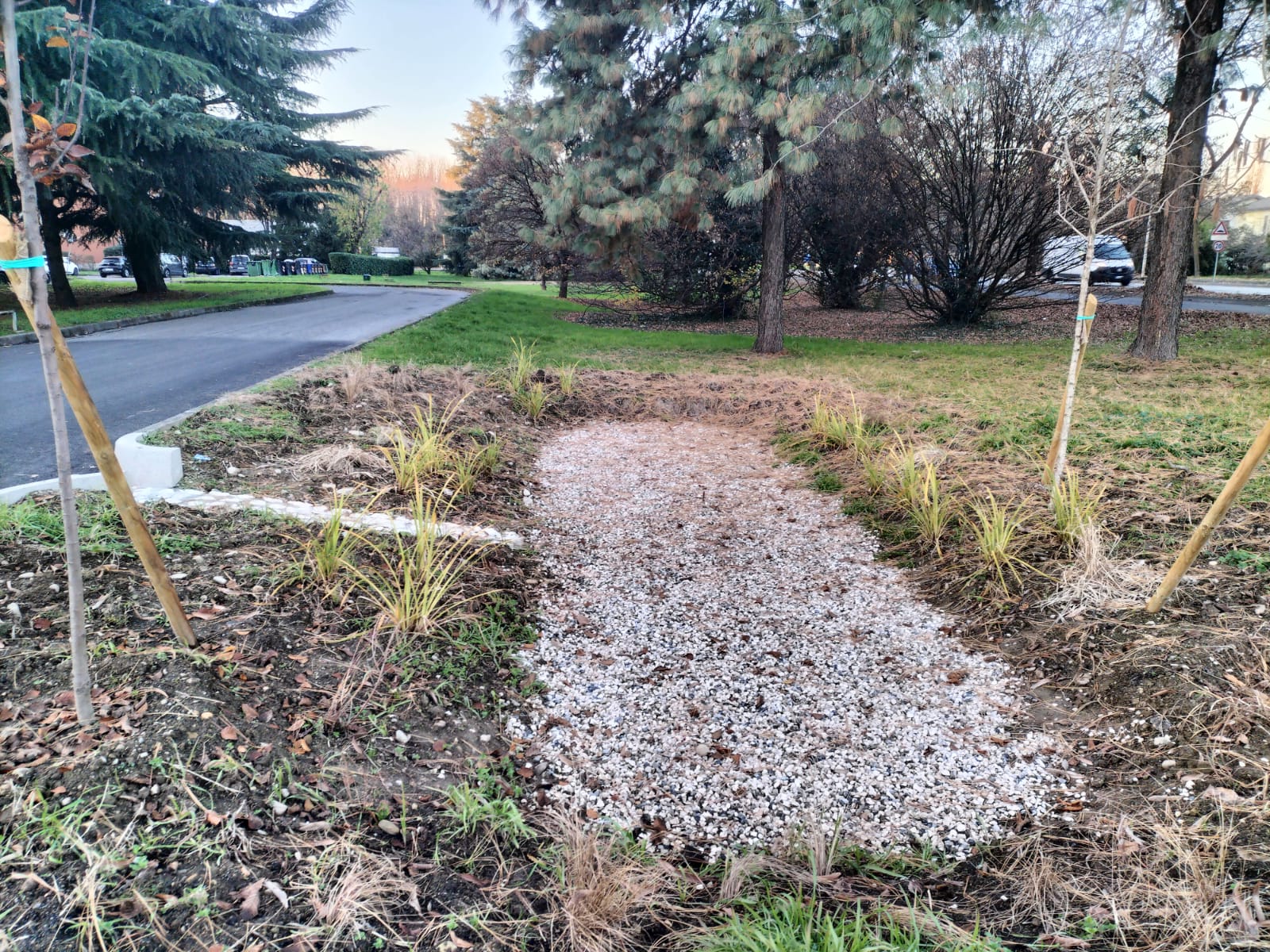 Nella parte sud di via della Repubblica è stato realizzato un parcheggio con autobloccanti drenanti, che permettono all’acqua piovana di infiltrarsi nel terreno. Lo spazio lasciato tra un elemento e l’altro, insieme al sottofondo in ghiaietto, aumenta ulteriormente la permeabilità del suolo e riduce il deflusso superficiale. Al centro dell’area pavimentata sono presenti caditoie che raccolgono le acque del corsello stradale. L’acqua viene convogliata tramite una tubazione in PVC verso il bacino di detenzione centrale, dove può essere temporaneamente trattenuta e gestita in modo sicuro. La parte restante del parcheggio è asfaltata, ma progettata con una pendenza mirata che indirizza le acque direttamente verso il bacino, senza bisogno di caditoie. L’area di infiltrazione in ghiaietto e le mantellate laterali garantiscono il corretto deflusso dell’acqua. L’anello esterno del parcheggio è stato inoltre piantumato, contribuendo all’assorbimento idrico e alla qualità ambientale dell’area. Per assicurare la tenuta delle pareti del bacino e trattare le prime acque di dilavamento, è stato installato un sistema di troppo pieno: durante eventi meteorici particolarmente intensi, l’eccesso idrico viene reindirizzato nella fognatura esistente, prevenendo allagamenti e sovraccarichi della rete.